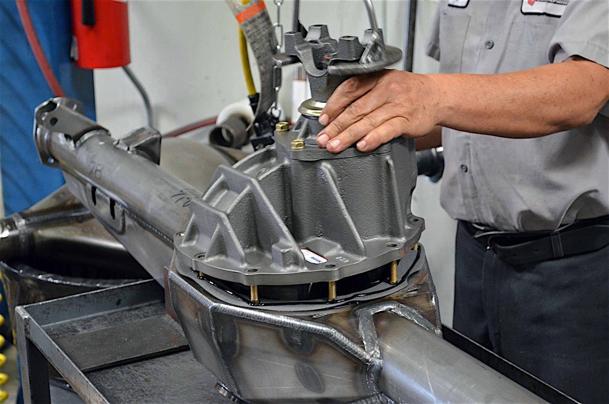 Bearings were pressed on as well as the wheel studs before being slid into the housing with the third member already installed. The pinion was spun to make sure everything worked without binding. The dawning of the red “C” fill/inspection cap signified the completion of the rearend.