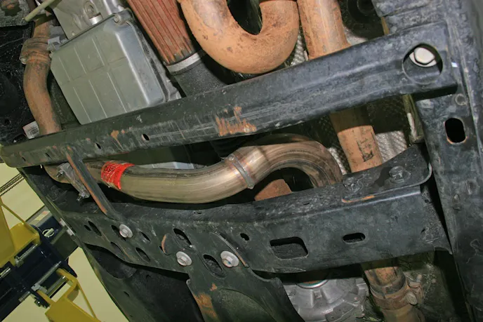 The next step is to remove the rear factory bumper support brackets and insert the Antirock bar in between the body and the muffler heat shield. This may be easiest done from the rear of the vehicle. We installed the Antirock mounting brackets on the rear bar, making sure the brackets were angled forward.