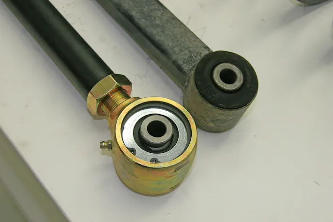 The grease fittings of the Johnny Joints should be on the same side, point down on the upper arms, and point up on the lower arms. The adjustable ends attach to the rearend on the upper arm, and to the frame on the lower arm. Don’t fully torque the bolts yet.