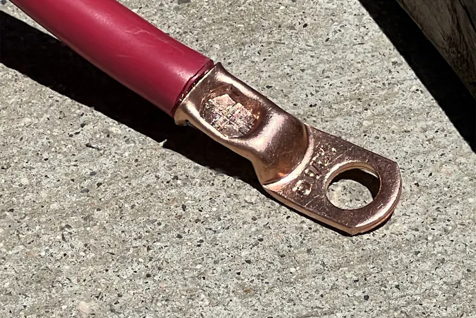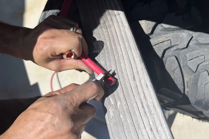 With measurements locked in, it was time to cut and terminate cables. The Moroso Remote Dual Battery Cable Kit came with everything: 25 feet of red positive cable, 8 feet of black negative, copper ring terminals, and shrink sleeves.