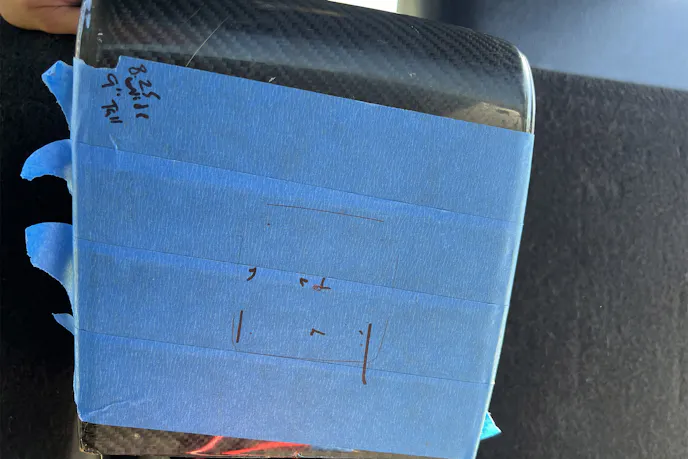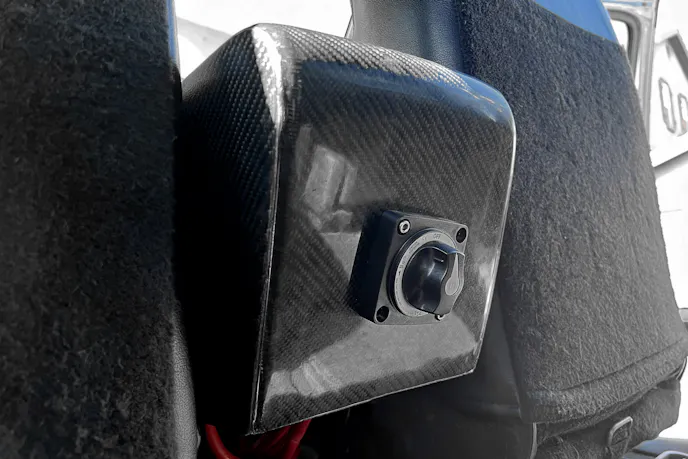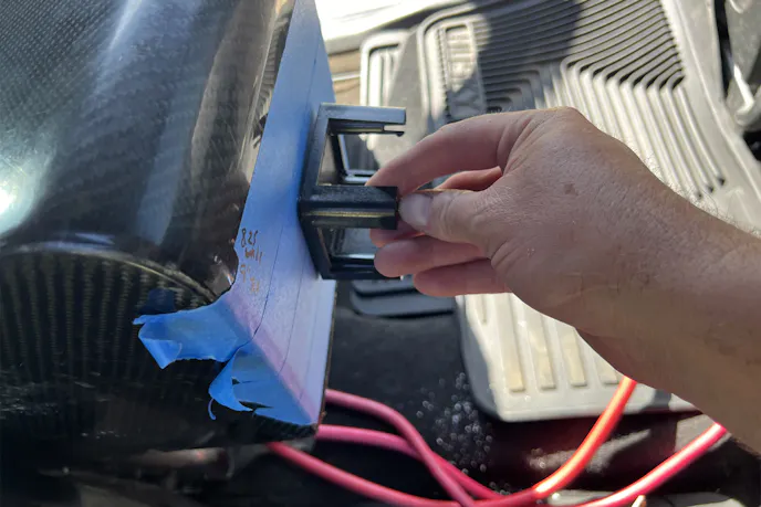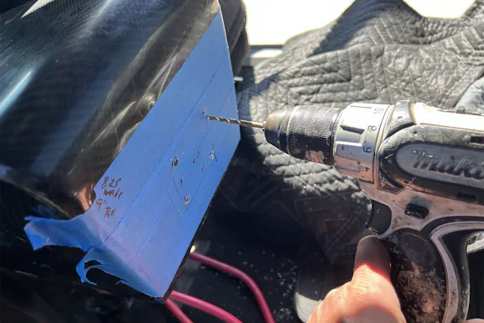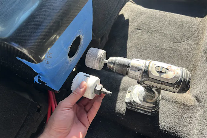 For the Blue Sea Systems 4-position selector switch, I taped off the backside of the FiberwerX carbon center console, measured twice, and cut once. A hole saw, barrel sander, and a couple of drilled holes later, the switch clicked into place like it was meant to be there.