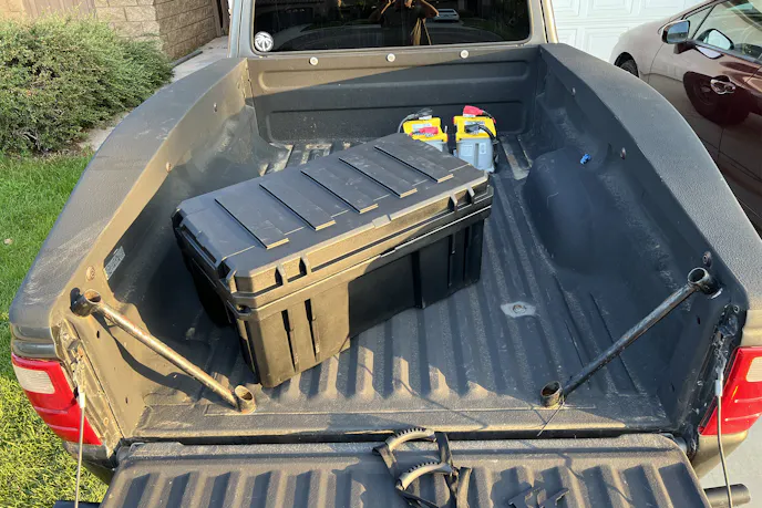 Instead of tucking them under the hood or inside the cramped Ford Ranger SuperCab, the plan was to mount both in the truck bed inside a Roam Adventure Co. Rugged Case. The Rugged Case solution would keep the batteries dry, dust-free, and out of sight while also doubling as secure storage for recovery gear, tools, and essentials.