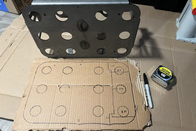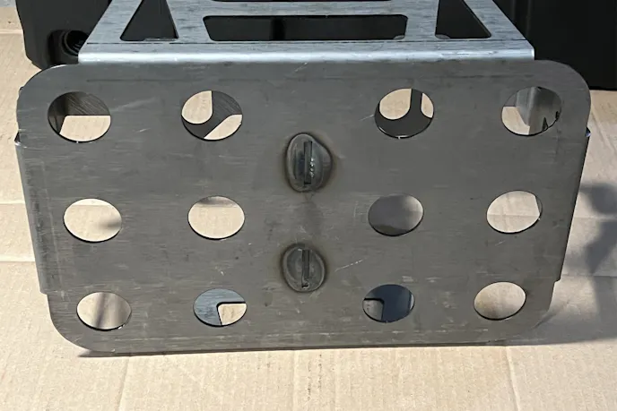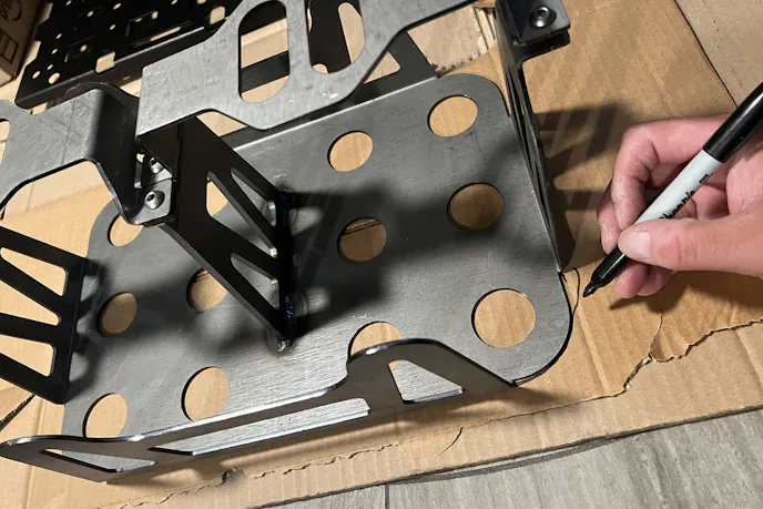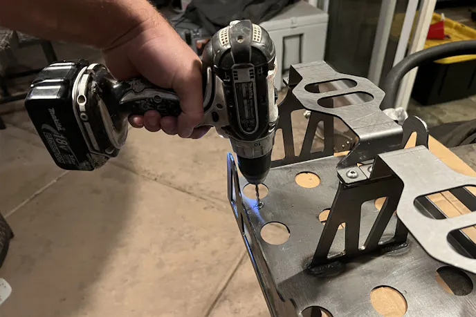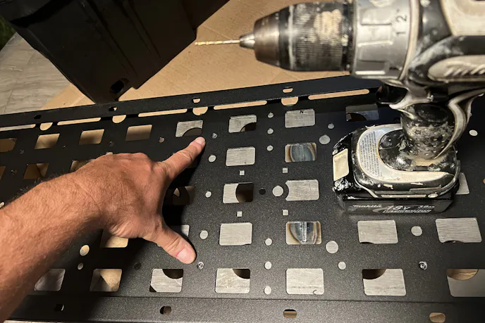Out came the cardboard templates and tape measure. I mocked up the RuffStuff tray inside the Roam Rugged Case, which sat on top of the Go Rhino Gear Plate. A few rounds of scribbling, measuring, and checking clearances later, I marked the final hole patterns for the battery tray. With a little Lucas Oil Tool Box Buddy for cutting lube, my tired cordless drill managed the pilots, but I pulled out a big plug-in drill to do the heavy lifting. By the time the fourth hole was countersunk, I’d turned the tray into a custom piece that mated perfectly with the plate.