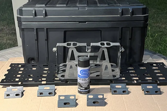 Once all the parts arrived, I spent a solid evening dry-fitting everything: bracket to bed, plate to bracket, Rugged Case to plate, battery tray inside the case. In the end, it came together exactly like I had pictured. There was even a bit of leftover plate real estate for future accessories, maybe an off-road jack at some point. For now, I will be securing a Rusoh Eliminator fire extinguisher for emergencies.