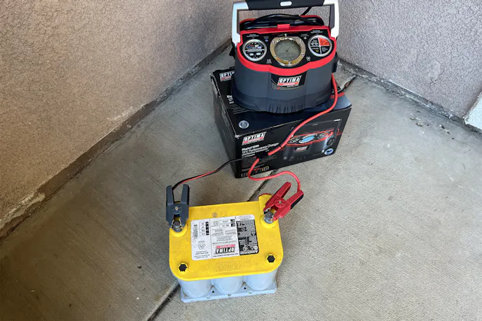 A few days before final battery installation, I took the extra step of conditioning the batteries with an Optima 12V Battery Charger 1200. Both YELLOWTOP D75/25 Deep Cycle Batteries were connected to trickle-charge overnight and throughout the next day. The Digital 1200 is designed to optimize Optima batteries specifically, balancing voltage across each cell for maximum lifespan and performance. After sitting on charge, both batteries measured strong and stable, a perfect baseline for the new dual battery system.