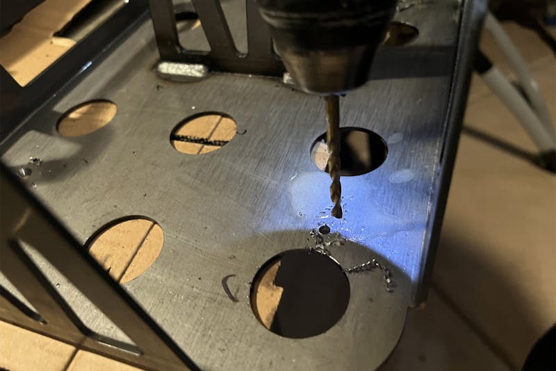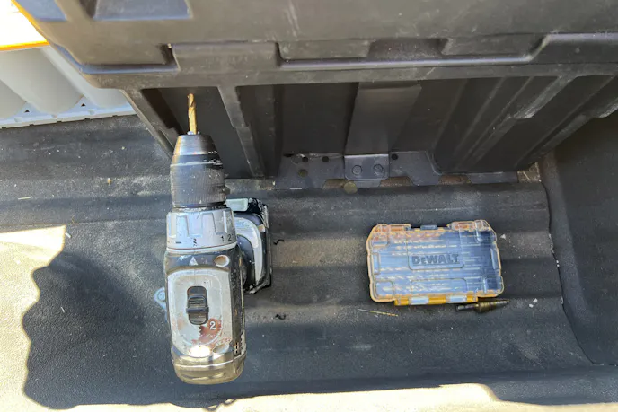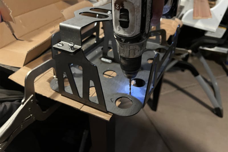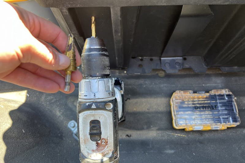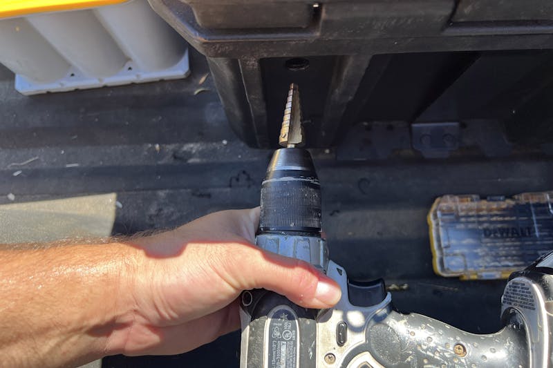 Out came the cardboard templates and tape measure. I mocked up the RuffStuff tray inside the Roam Rugged Case, which sat on top of the Go Rhino Gear Plate. A few rounds of scribbling, measuring, and checking clearances later, I marked the final hole patterns for the battery tray. With a little Lucas Oil Tool Box Buddy for cutting lube, my tired cordless drill managed the pilots, but I pulled out a big plug-in drill to do the heavy lifting. By the time the fourth hole was countersunk, I’d turned the tray into a custom piece that mated perfectly with the plate.