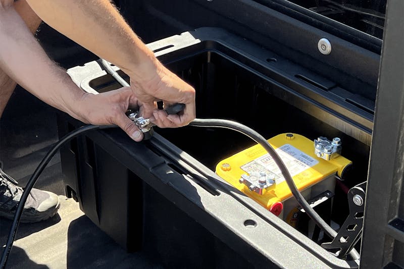Mounting heavy batteries in the forward bed position also shifts weight closer to the center of the truck. That’s good news for handling in a truck that’s already pushing its limits when loaded for trips.