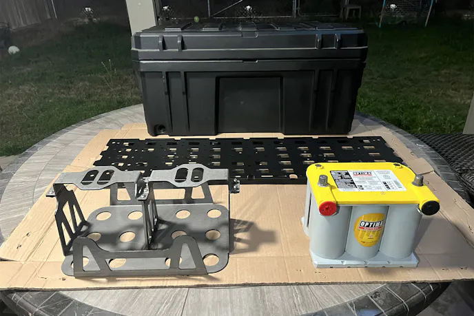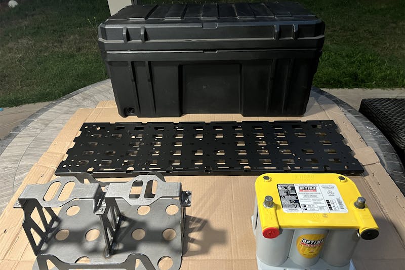 Eventually, I had a pile of parts: the two Optima YELLOWTOP D75/25 Deep Cycle Batteries, a Roam Adventure Co. 105L Rugged Case, the RuffStuff R1175-Kit-1 Dual Battery Box, the Go Rhino Accessory Gear Plate, all the items making up the Moroso Battery Cable Kit, a few miscellaneous items from Amazon, and enough stainless bolts and countersunk screws to outfit a sailboat. Now it was time to quit thinking and start wrenching.