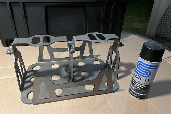 Once the drilling was done, I wiped down the tray and other items with acetone and then applied a layer of black polyurethane STEEL-IT coating. This finish adds corrosion resistance and ties the look together with matte black on the rest of the build. It is functional and slick without screaming for attention.