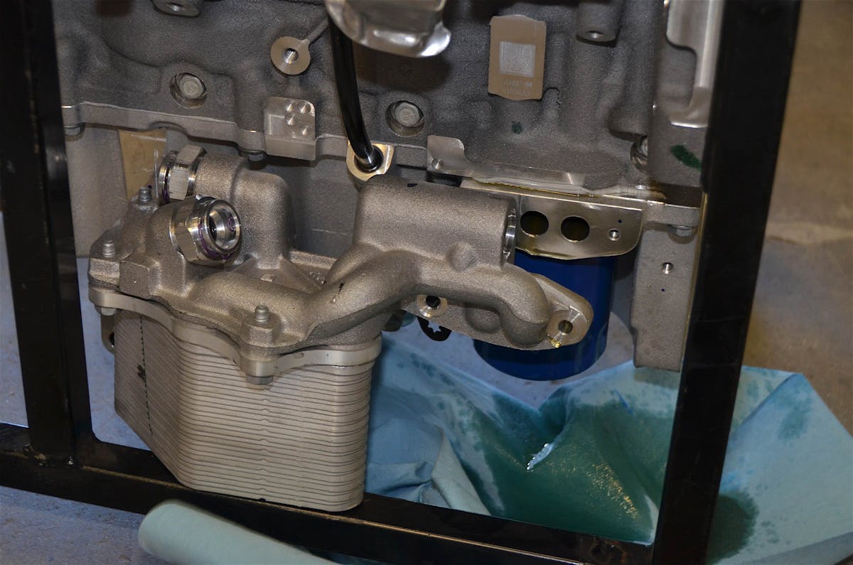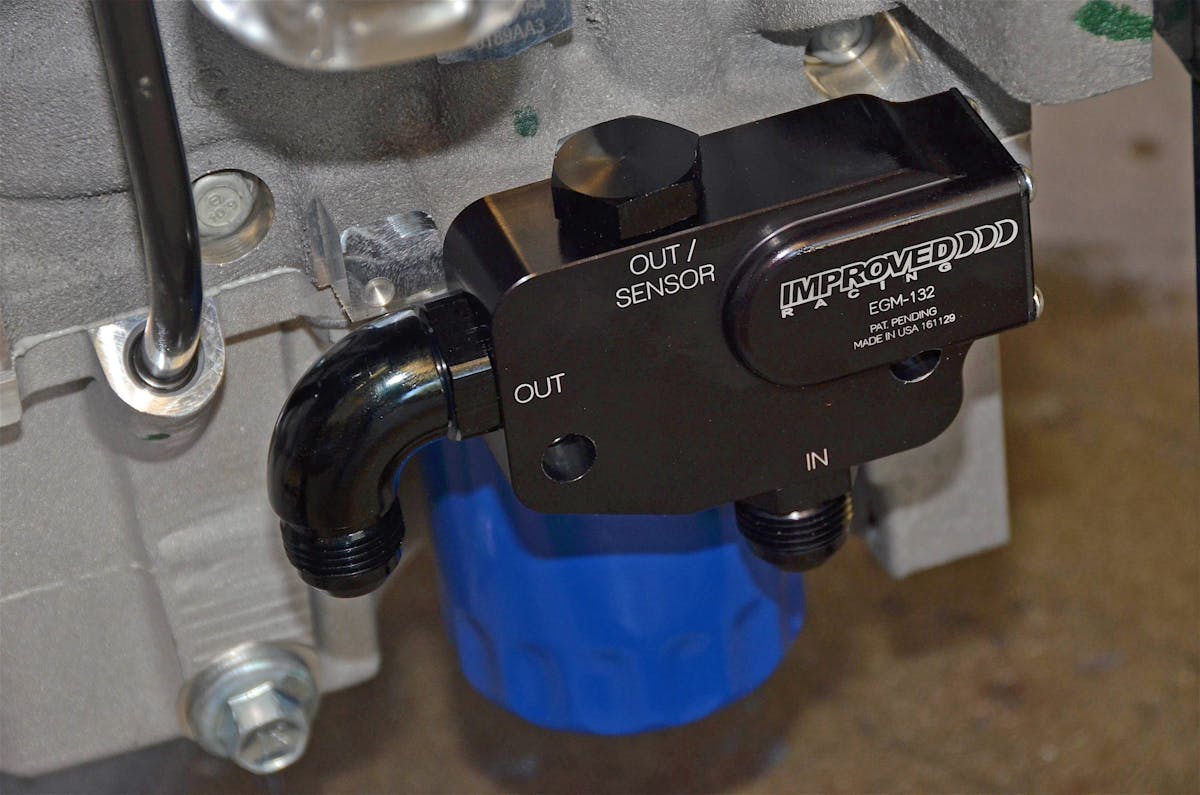 Adding the oil cooler adapter would allow us to run an external oil cooler. “The thermostat bypasses the oil cooler until engine oil reaches operating temps, allowing for quick warm-ups and eliminating pressure drops at low temperatures when oil is more viscous,” Ihns continued. “Engine oil will warm up just as quick with our thermostat as it does with the factory water-to-oil cooler.”