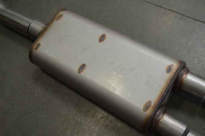 Fit the muffler onto the back of the head pipe, keeping it level; this will ensure the tailpipes are properly aligned. Route the new tailpipes over the rear axle assembly and onto the back of the new muffler, we found that installing the right side pipe first worked well. Each tailpipe has a tab welded to the side of it. These tabs are designed to be bolted together to keep the pipes a specific distance apart from each other.