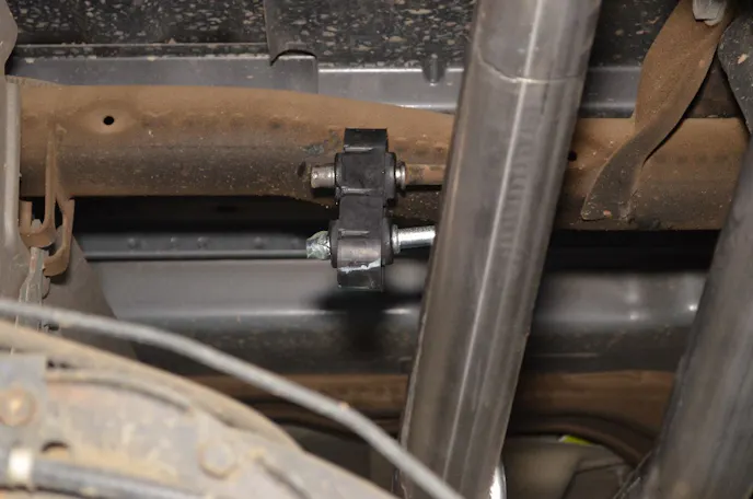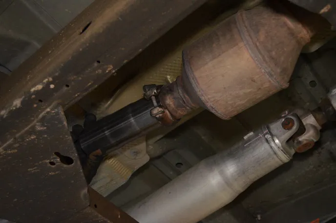 The factory exhaust system is suspended by rubber isolators. Unbolt the joints and use a pry bar to pop the isolators off the hangers. After removing the original exhaust, install the new adapter tube to the back of the catalytic converter. Leave the hardware loose for final adjustments later on.