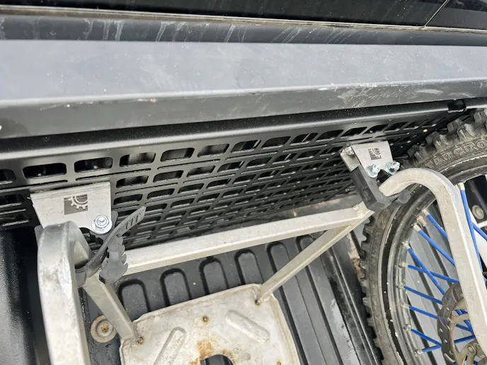 The BuiltRight Bedside Rack System for our 2020 Toyota Tacoma is a mega-handy, quality product. For example, we now have our extra gasoline safely and securely mounted. We’re using two of the Quick Fist Original Riser Mounts to secure our motorcycle stand into place on the cab wall panel. We also use Quick Fist Riser Mount Super Clamps to secure our motorcycle ramp during travel. Overall, the rack system has not only made the securing of our gear so much safer, but it also allowed us to save space in the bed by mounting gear more efficiently. Prior to this, everything was tied up in a bird’s nest of ratchet straps. Furthermore, we didn’t have much ability to fit more gear then previously listed just because of where things had to sit. Now if we want to, we could also fit a small cooler, more gas, and so on.
