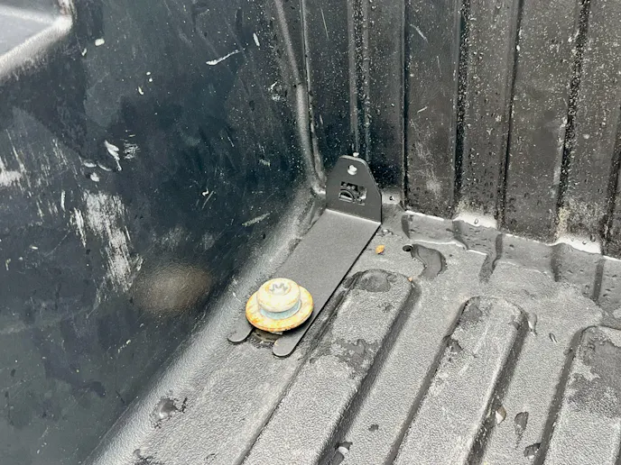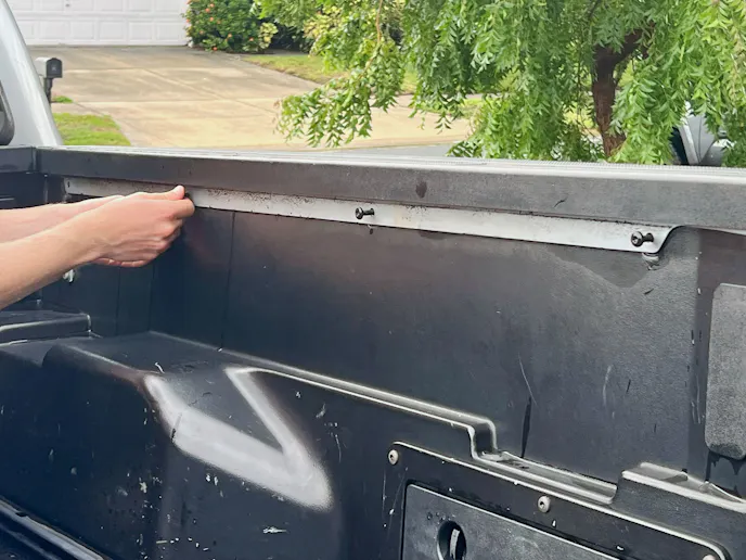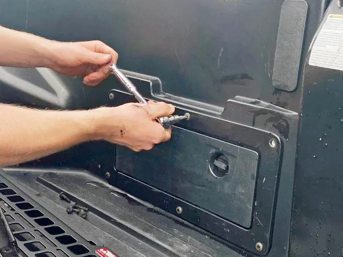 Highlights of the bedside installation are shown in these three photos. There are two panels for each side of the Tacoma, and the procedure is similar for each side. We started on the passenger side (shown) by loosening the bolts that secure the utility rail to the bedside. Next up, we removed the two rear-most bolts and slid the rear panel under the rail and reinstalled the bolts loosely. Our Tacoma has a passenger-side cubby in the cargo bed, and the rear-most panel utilizes two of the bolts that hold the cubby in place. For the front panel, we removed the two front bolts then slid the panel under the rail and reinstalled the two bolts. The final step was to tighten all fasteners.