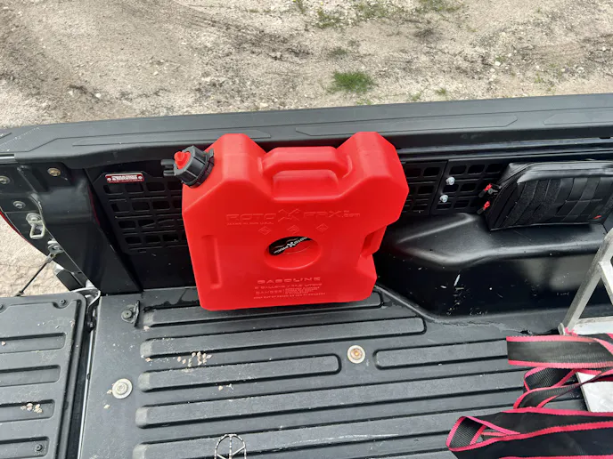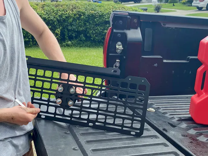 We used the BuiltRight Bedside Rack System to mount a RotopaX fuel container, which is a common item used with the rack system. We forgot to order BuiltRight’s mount for the RotopaX mounting system. Consequently, we needed to include some fender washers to mount the RotopaX mount to the bedside rack. Since we weren’t installing the MOLLE nuts, we found that it was easier to install the RotopaX mount before installing the panel. We mention this because while our method works, the best setup is to use BuiltRight’s RotopaX mount.