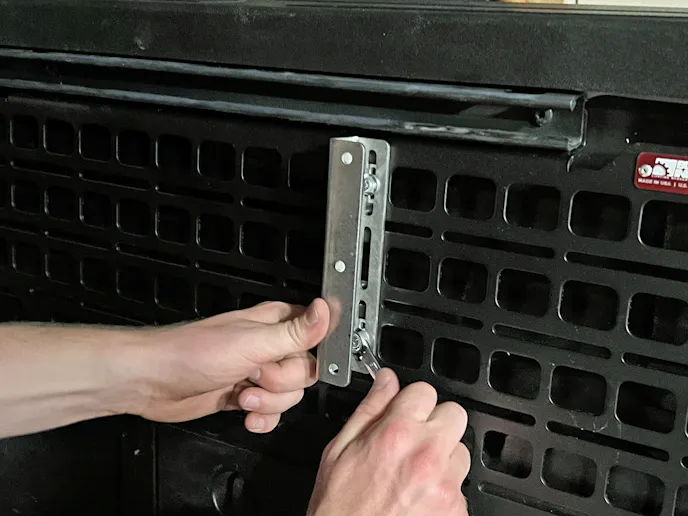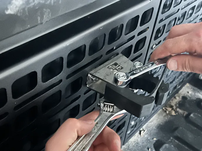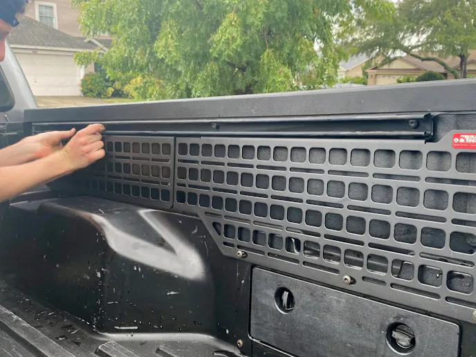 These three photos show the highlights of how easy it is to install the Cab Wall MOLLE Panel Kit. Following BuiltRight’s instructions, we loosened the two bed bolts closest to the cab, and then positioned an L-bracket below each bed bolt. After removing the fasteners holding the rail cap, we installed the MOLLE panels loosely to the top rail using the factory hardware. We bolted the two panels together with the included hardware and then attached each panel to the L-brackets. The final step was to tighten all the hardware.