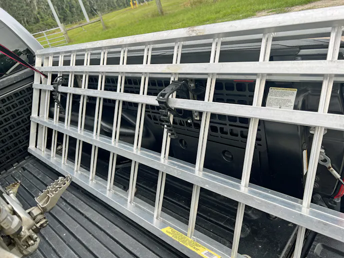 We’ll admit that prior to the BuiltRight Bedside Rack System we had a janky way of hauling stuff. For example, during our dirt bike forays, we creatively used tie-downs to keep our gas can, ramp, and other items attached to our Tacoma as shown here. It worked, but we spent a lot of time messing with the tie-downs and we often worried about something coming unraveled as we were driving.