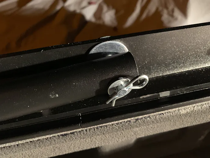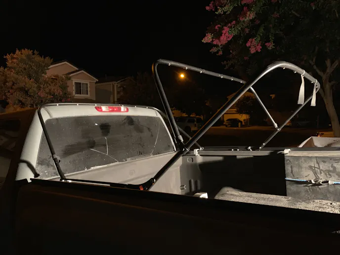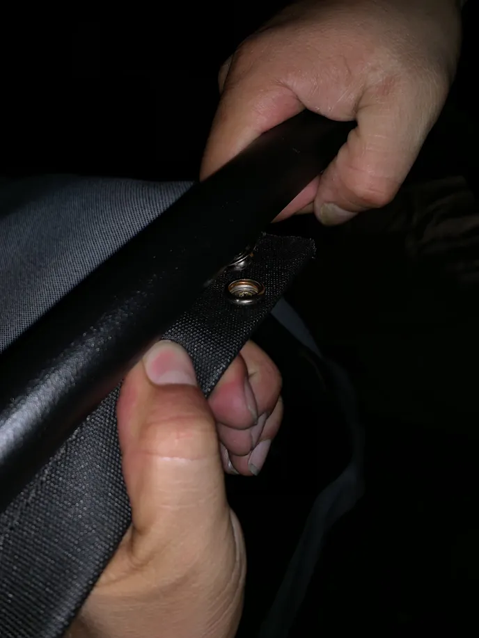 We were able to secure all the snap fasteners which led to the next step. We had to slide the rigid plastic strips on the bottom of the fabric under the metal lip of the bed rails. Once that was done, we had assembled the skeleton of the Supertop.