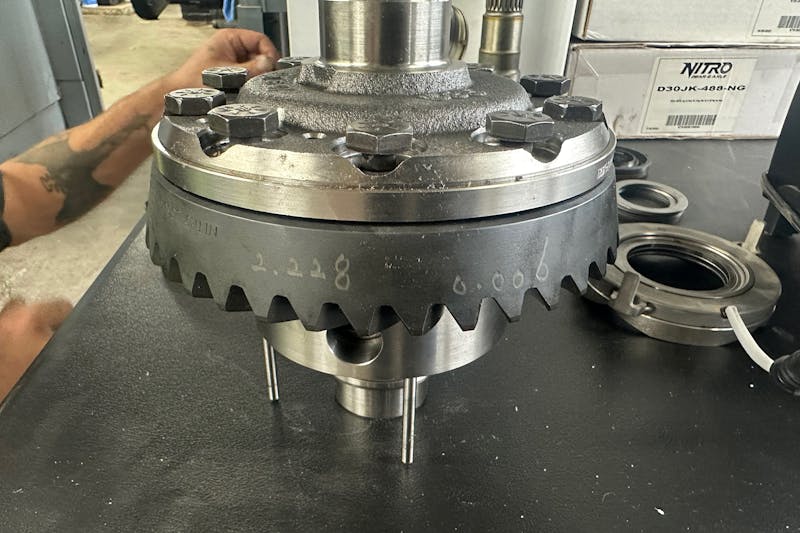 Each axle received its matched Nitro Gear & Axle 4.88 ring and pinion set. Pinion depth was set using shims, and new crush sleeves were installed. Pinion bearings were pre-lubed, and pinion preload was set according to spec.