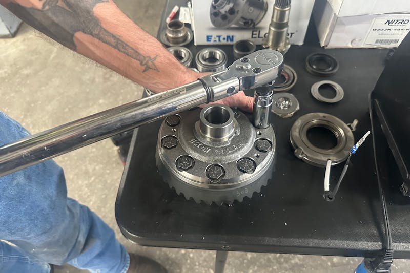 Ring gears were bolted to the Eaton locker cases with thread locker applied, then torqued in sequence. Backlash and gear contact patterns were checked using marking compound to ensure proper setup.