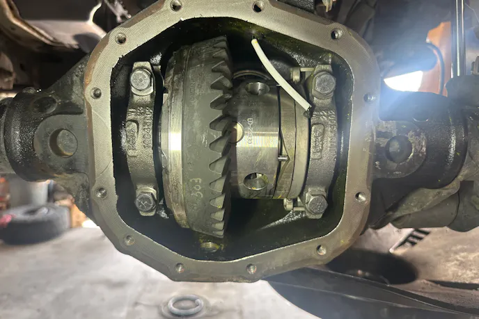 Brake calipers and rotors were removed for better access. Axle shafts were pulled, and the carrier assemblies with ring gears were carefully removed and labeled for reference.