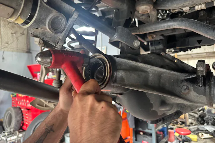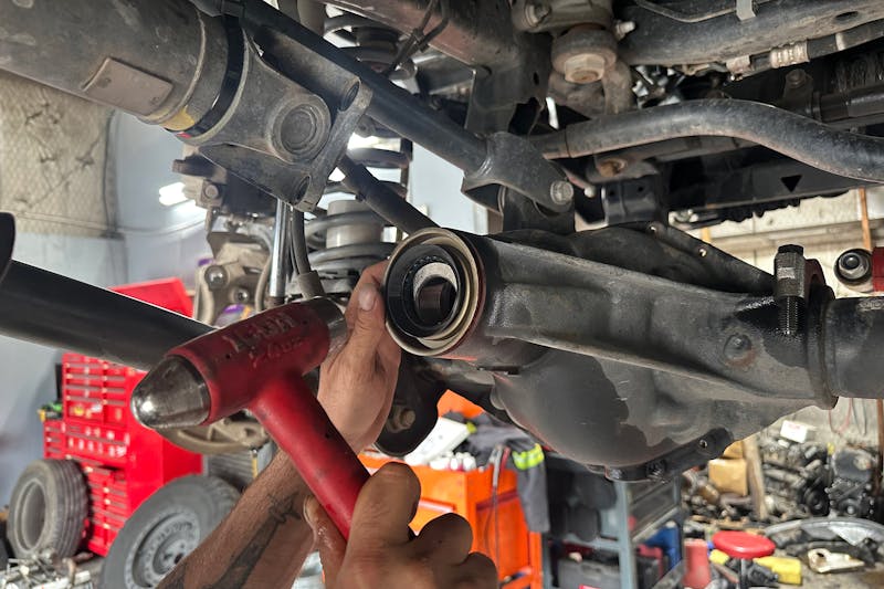 Pinion yokes were pulled using an impact and puller setup. Factory 3.45 gears and bearings were removed from both the Dana 30 M186 and Dana 44 M220. This was also the time to inspect axle seals and housing surfaces for any wear or damage.