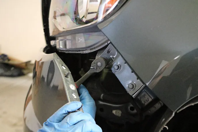 There were several bolts that held the headlights onto the front of the vehicle. Many of them we hidden. We started with the easy ones on the top of the light housing.