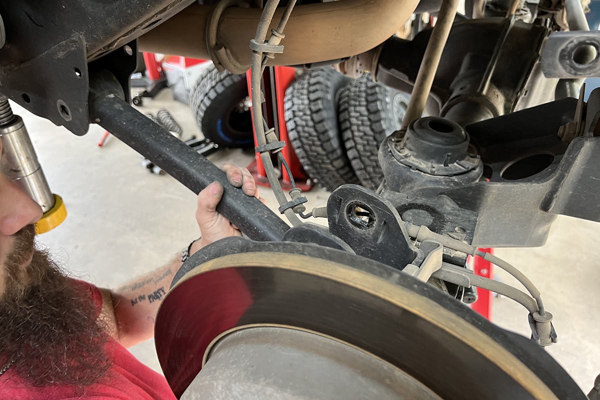 After Smith had the front buttoned up, it was time to turn our attention to the rear of the vehicle. Like the front, installing the rear suspension was free from any challenges. It’s evident that Maxtrac did its homework on this kit, as the fit and finish are superb. Once again, Smith secured the rear axle, removed the factory components, and replaced everything with Maxtrac, including the adjustable upper and lower control arms, rear coil springs, bump stops, FOX shocks, Trac bar relocation bracket, and brake line relocation brackets.