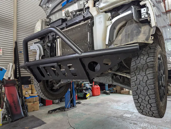 Before going gung-ho, and adding a winch and lighting up front, some form of protection had to be put into place. Not only was the dinky temporary LED foglight bracket I had been using wobbly as hell when attached to the Deck Van’s plastic bumper, but it didn’t offer crap for security when forging my way off-road. Since this is a relatively obscure chassis, brush guard options seemed limited, until I stumbled upon OVERTECH.