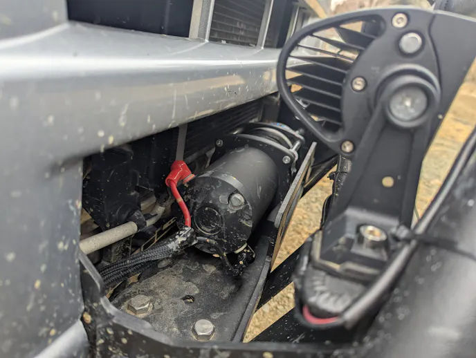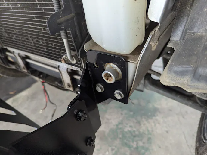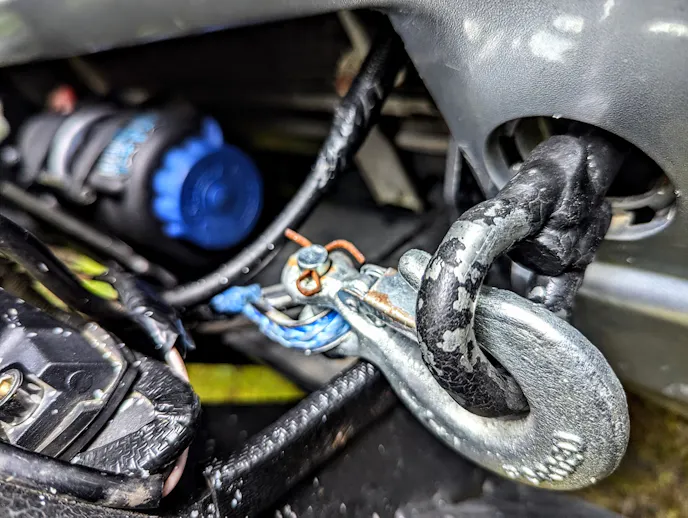 Then, when it came time to mount the winch, we welded the reverse mounted corners of the bracket to the brush guard’s mounts and added some oversized bolts so that everything could be taken apart piece-by-piece as necessary. We also shaved out some of the fins in the center of the OVERTECH skid plate so that the winch could be fed directly through, and lined all of the edges with heavy-duty automotive door jam guards to prevent rope fraying. Hood pin quick releases were then added to the license plate mount so it could get easily popped off with the push of a button when the winch was needed and then easily reattached afterwards.
