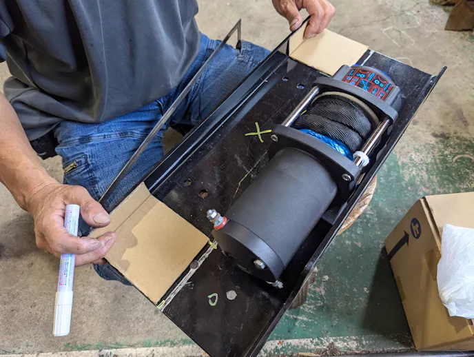 But while the winch did clear the condenser and the backside of the brush guard, finding a place to securely mount it posed a massive problem. The winch mounting plate Holley sent us was a massive hunk of a thing. Not only was it entirely too large and heavy, but there was no way to mount the damn thing. So, we made a cardboard template, chopped the plate up into pieces, drilled some holes, and welded up a custom unit constructed from the corners and center of the mounting plate.