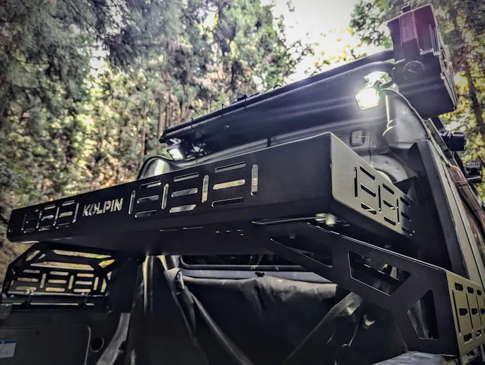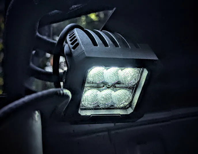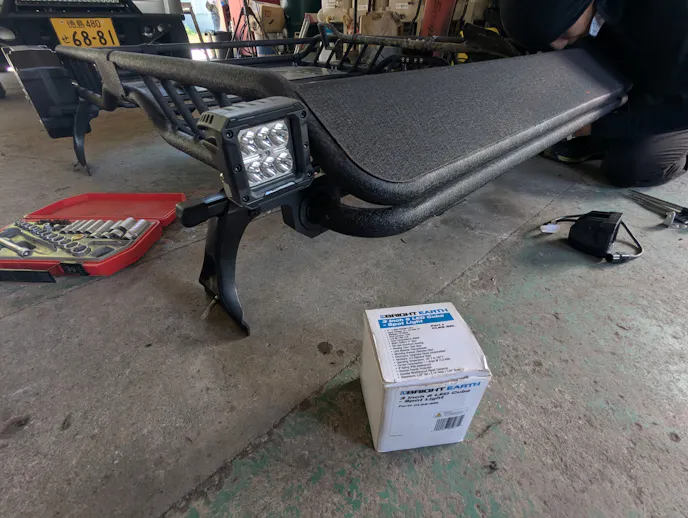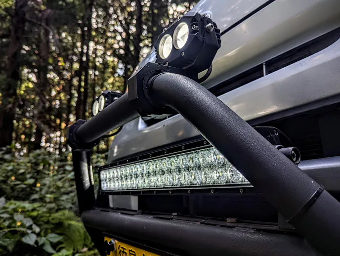 Out back, a set of flood lights from Bright Earth were also installed, with a duo of spotlights making their way onto each front corner of the carrier rack. This allows additional lighting up front during dodgy night excursions and inclement weather, and a sweeping span of light over the deck for when it is time to unload gear at the campsite at night, or for when I have to hack up a wild hog at dusk.