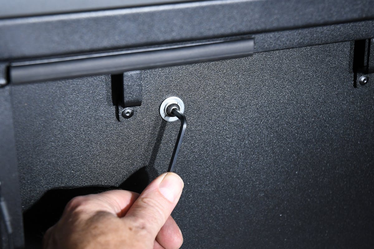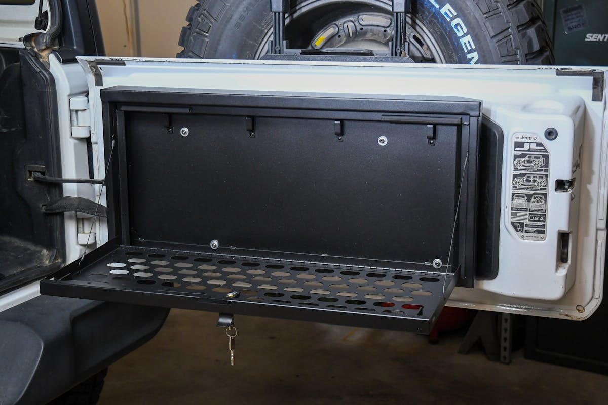 Now that we could secure two previously existing areas in our Jeep, it was time to add a new one. For that, we called on Tuffy’s heavy-duty, high-security lockbox. The lockbox is designed to be mounted on the inside of the Jeep JL tailgate, offering ample secure storage for tools and gear. Its innovative design features a door that folds down, creating a convenient work table for cooking or quick sorting and access to the lockbox contents. The lockbox can support up to 40 pounds.