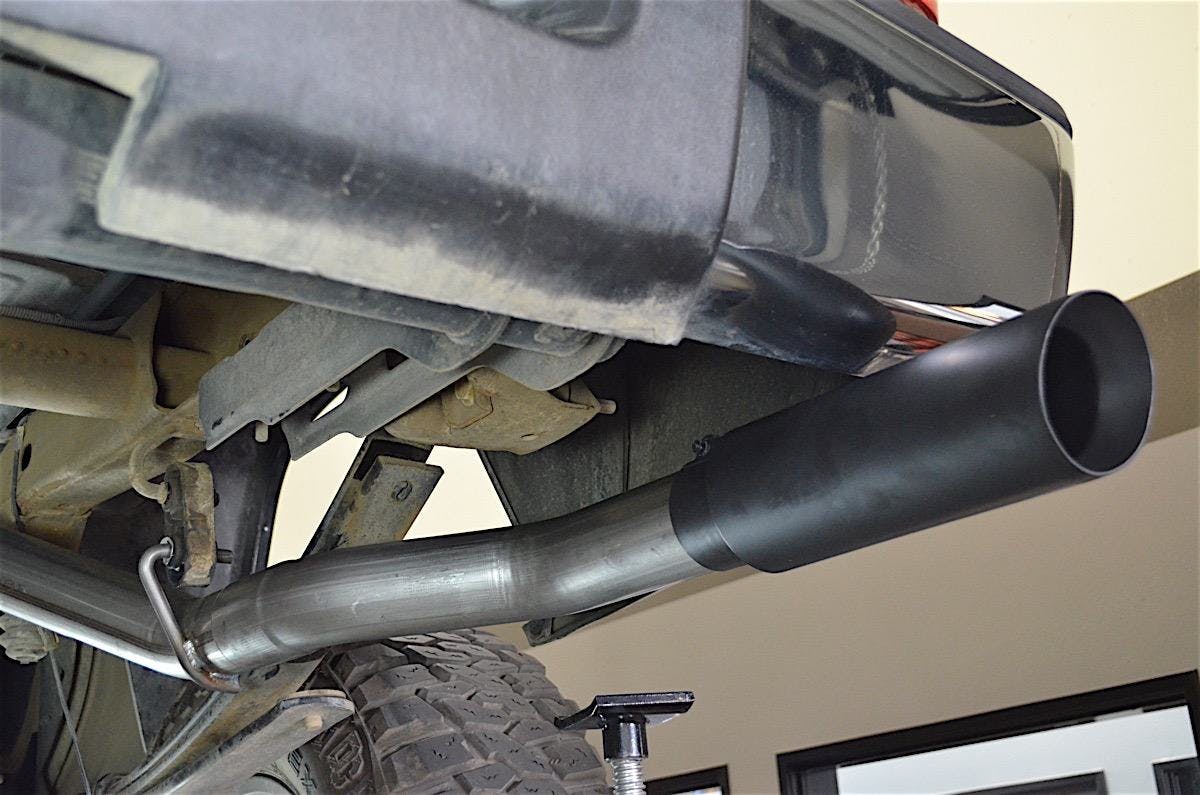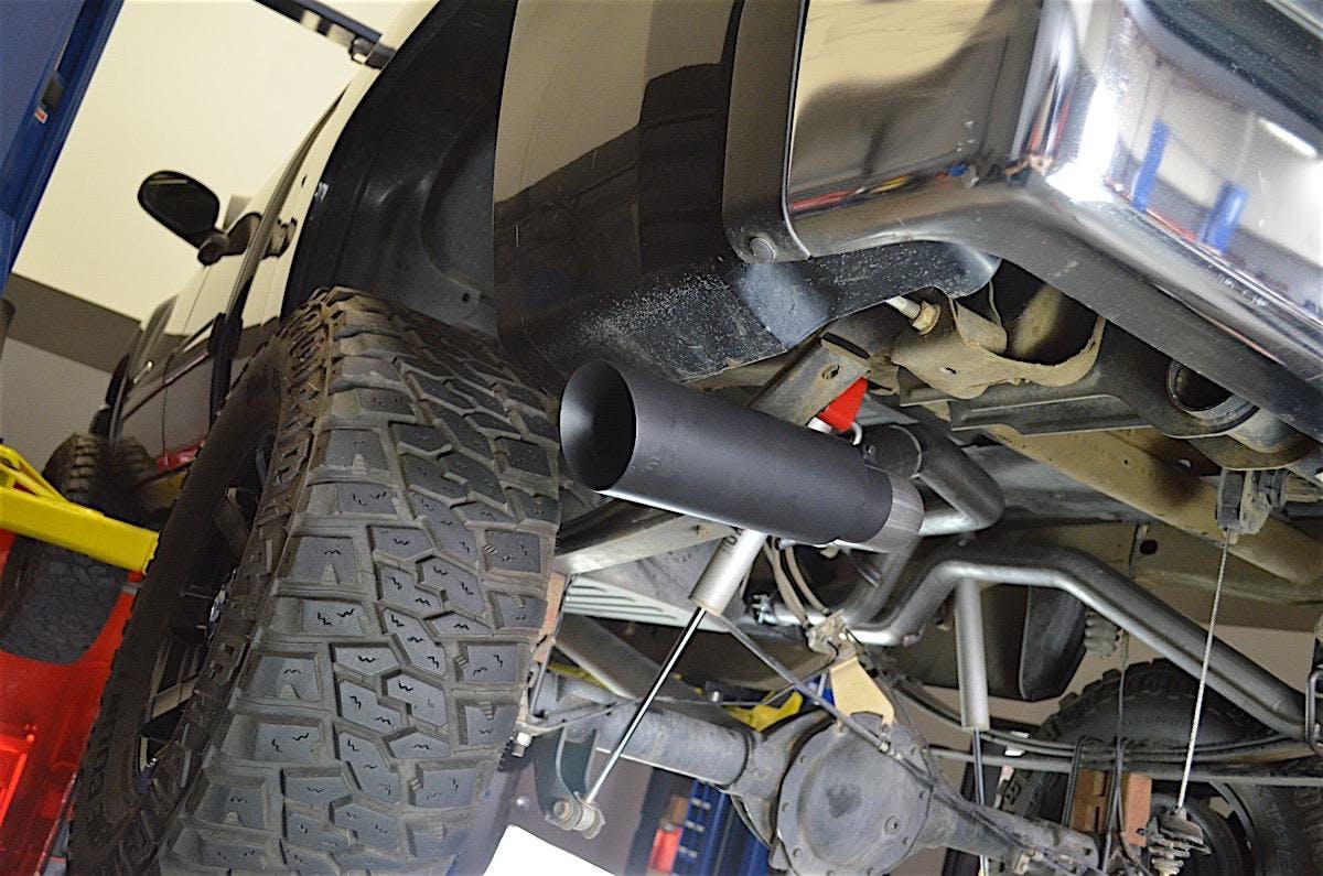 Flowmaster’s system can be had with either side exit or rear exit. The rear sections of the tailpipes differ to allow for the exit point you desire. The driver side utilizes a mid-pipe, allowing the system to have an easier install around the differential and spare tire.