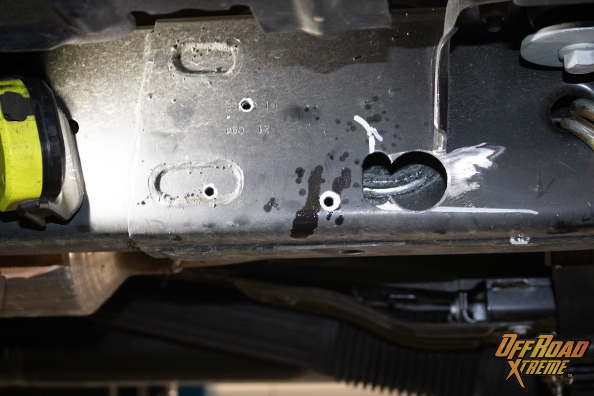 Continuing on, the Fabtech rear link mounting brackets were mocked up and temporarily bolted into place to use as a template to identify where to mark for drilling. Finally, a hole saw was used to bore out a large enough opening to allow the installer to manipulate the mounting hardware inside the frame cavity. The Fabtech rear link mounting brackets were all mocked up into the final position. This would be repeated on the opposite side.