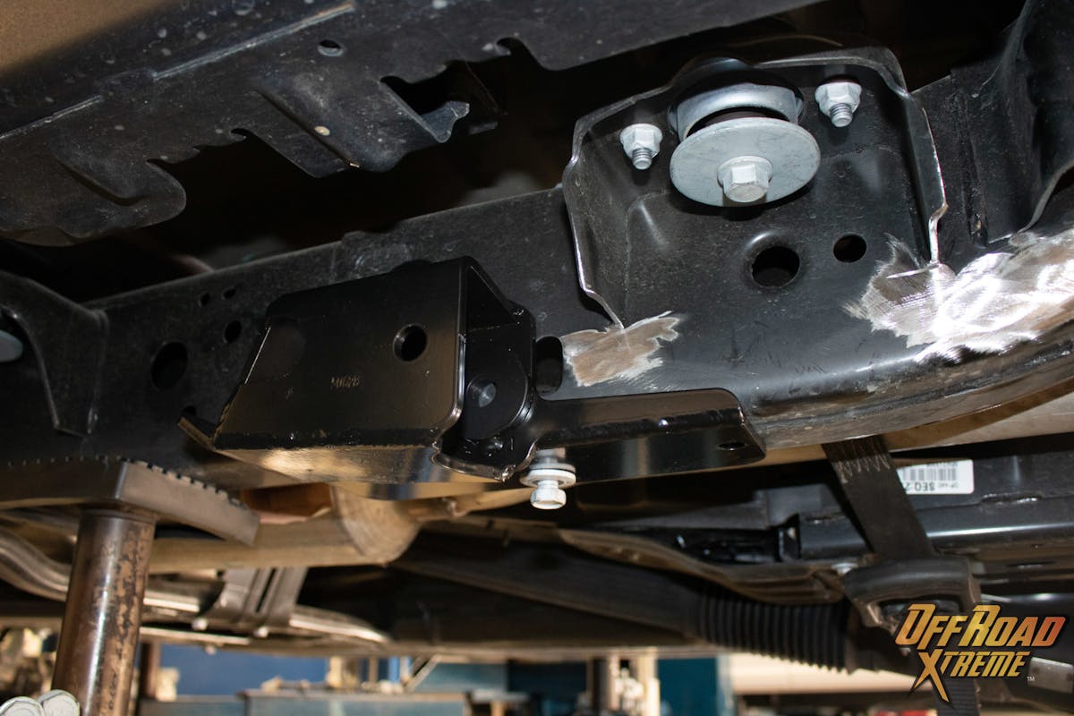 Continuing on, the Fabtech rear link mounting brackets were mocked up and temporarily bolted into place to use as a template to identify where to mark for drilling. Finally, a hole saw was used to bore out a large enough opening to allow the installer to manipulate the mounting hardware inside the frame cavity. The Fabtech rear link mounting brackets were all mocked up into the final position. This would be repeated on the opposite side.