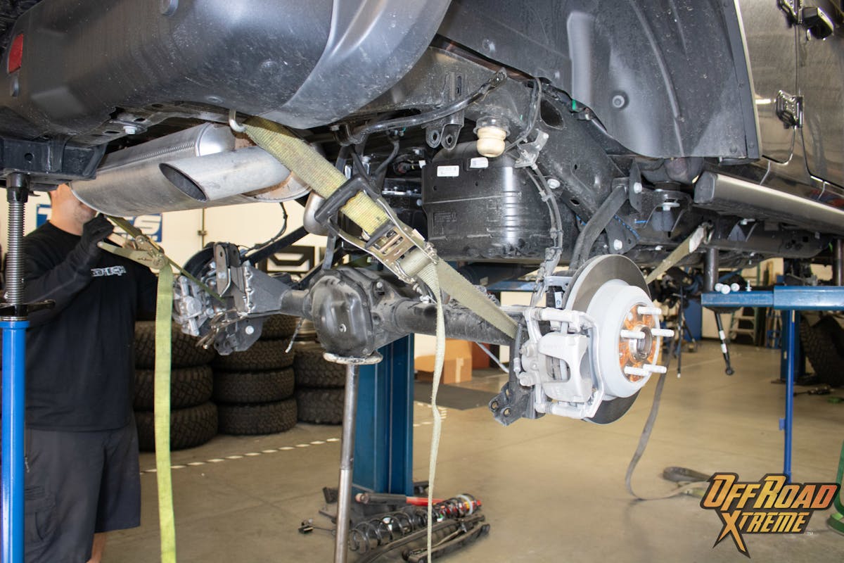 In standard fashion, the negative battery terminal was disconnected before we began. The vehicle was lifted up in the air and then the front and rear were supported by jackstands. The tires were removed and then we secured the housing before starting the disassembly. The axle housing was strapped up and supported from either side of the vehicle with heavy-duty ratchet tie-downs as well as another jackstand underneath. This gave us full control to free up whatever side we were currently working on.