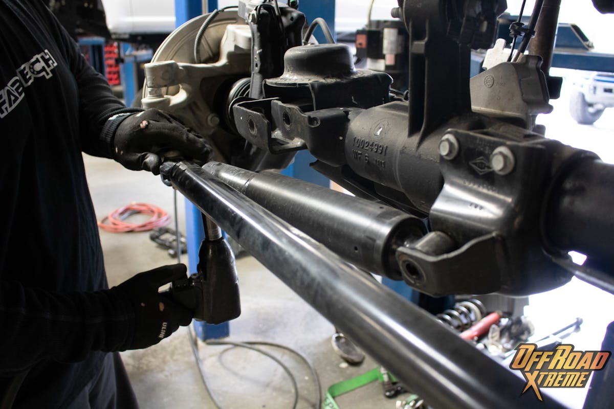 The Fabtech Long-Arm Crawler System includes the Drag Link Kit P/N FTS24210 as part of the kit. Following the call out of the instruction pamphlet, we harvested parts off of the old drag link bar and fitted it to the supplied drag link. Everything was assembled according to the directions, and then we reamed out the steering knuckle to fit the oversized heavy-duty ball joint. Shawn installed the new drag link bar and torqued her up tight as specified.