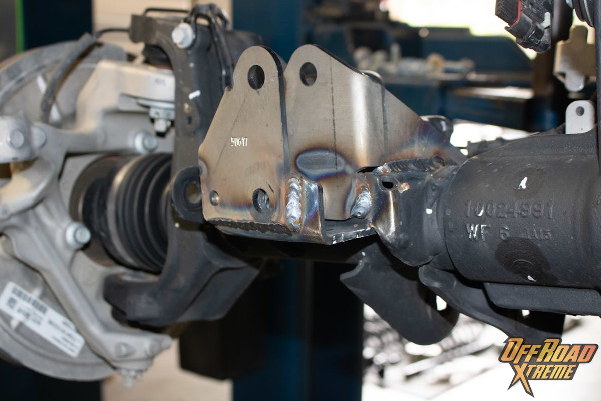 Again, we use the supplied brackets as a template and matched the hole with the removed OEM hardware. It can only go one way, so make sure to fit it cleanly so it sits level. Once into position, we fixed the new fabricated track bar mount into place with a clamp and welded it into position according to the instructions. In the end, the brackets are both bolted and welded into place.