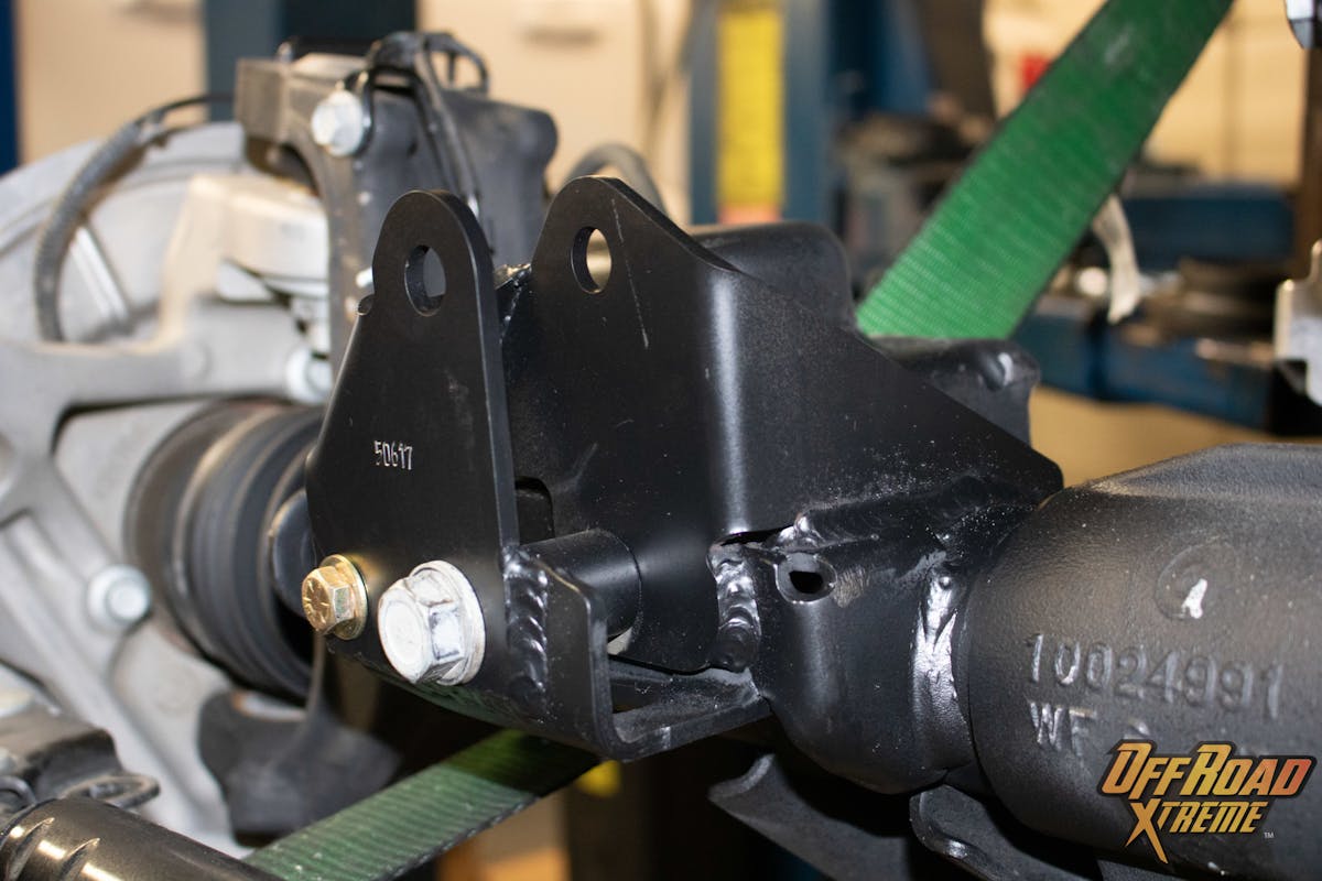 Moving up to the front, this track bar bracket is also just as simple. If you have not already, remove the track bar arm and begin cleaning up the bracket to fit the supplied Fabtech track bar bracketry.