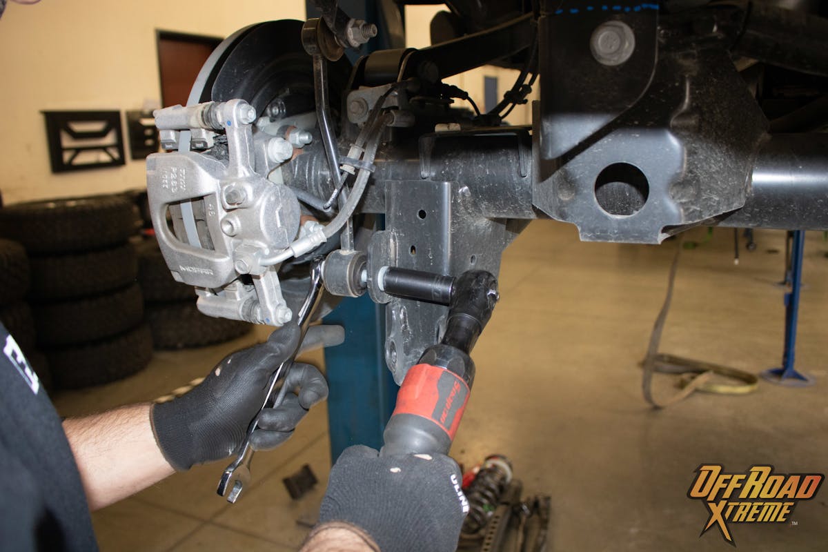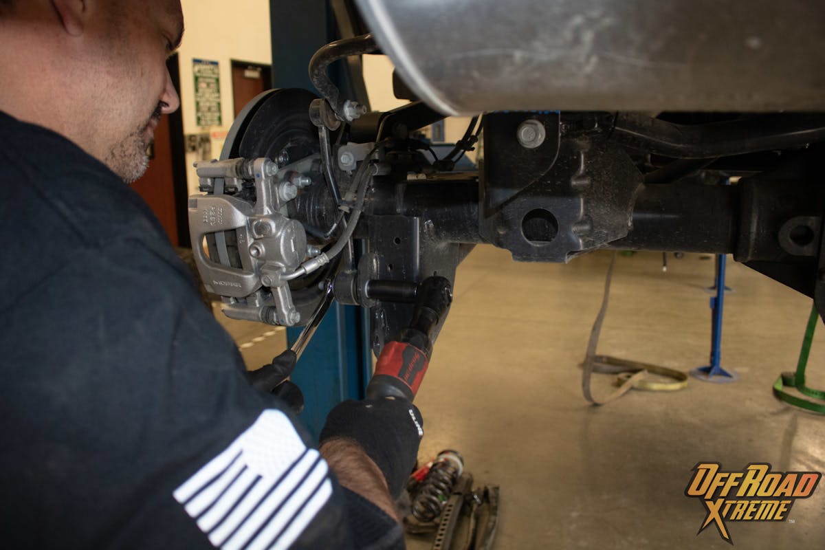 In standard fashion, the negative battery terminal was disconnected before we began. The vehicle was lifted up in the air and then the front and rear were supported by jackstands. The tires were removed and then we secured the housing before starting the disassembly. The axle housing was strapped up and supported from either side of the vehicle with heavy-duty ratchet tie-downs as well as another jackstand underneath. This gave us full control to free up whatever side we were currently working on.