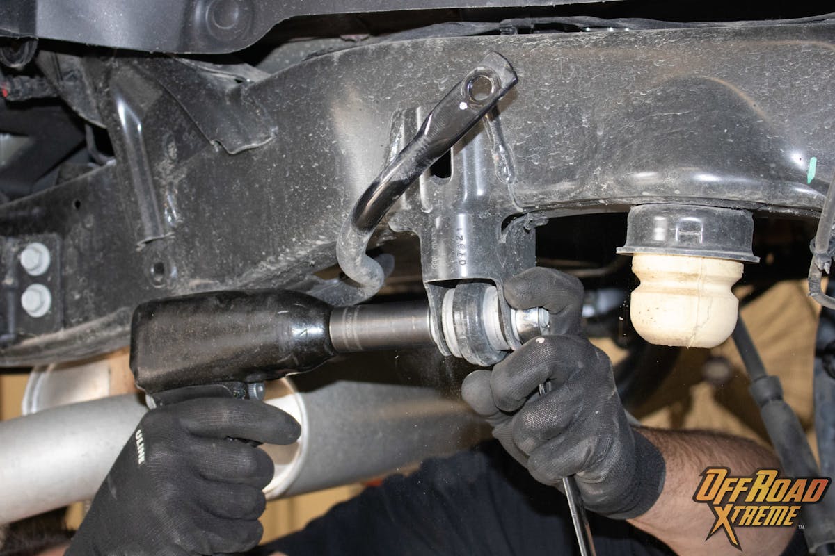 The upgraded Dirt Logic 2.25-inch shocks are a nearly bolt-on replacement for our Jeep JL, but because of the new shock’s large cap and shoulder, they require a bit of clearancing to fit. Shawn used a cutoff wheel to square off the obstructing material and we quickly had the Dirt Logics mounted into position.