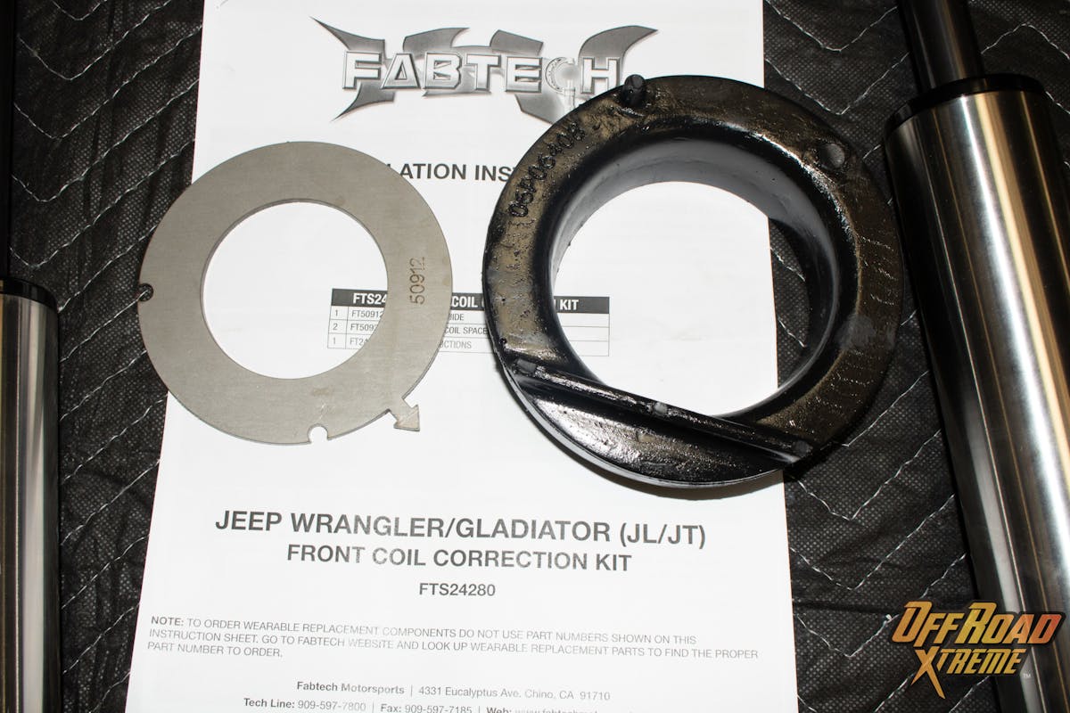With the taller-lift springs, Fabtech supplied a Coil Correction Kit P/N FTS24280 that locks the coils into a straight and correct orientation. The factory upper and lower spring isolators are removed. The lower plastic isolator can be discarded and will not be used again.