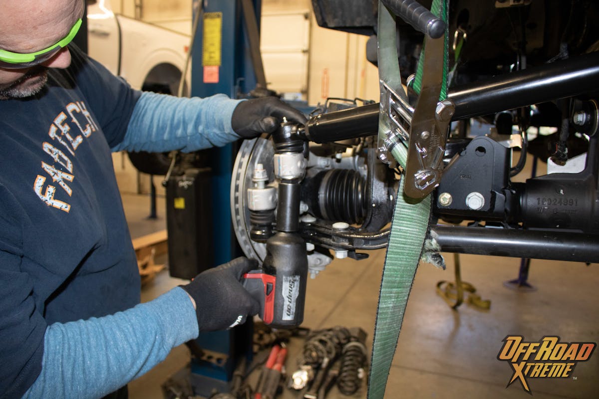 In standard fashion, the negative battery terminal was disconnected before we began. The vehicle was lifted up in the air and then the front and rear were supported by jackstands. The tires were removed and then we secured the housing before starting the disassembly. The axle housing was strapped up and supported from either side of the vehicle with heavy-duty ratchet tie-downs as well as another jackstand underneath. This gave us full control to free up whatever side we were currently working on.