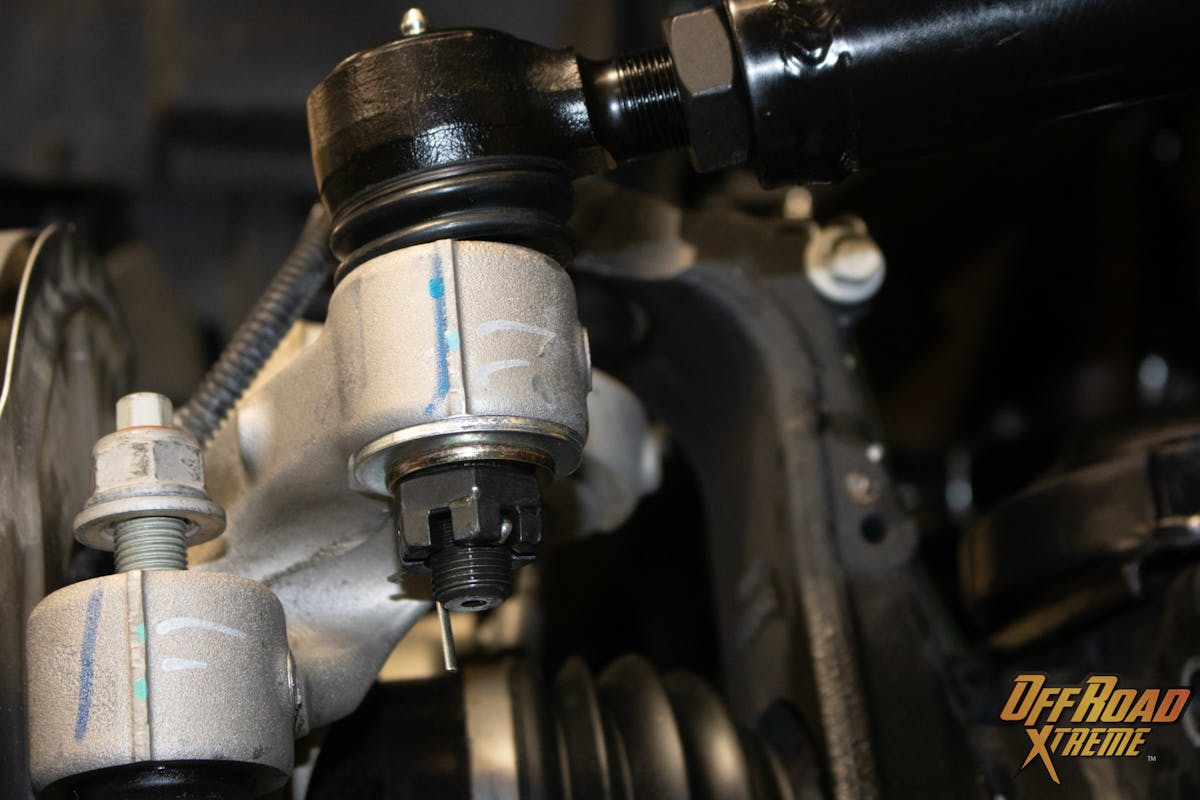 The Fabtech Long-Arm Crawler System includes the Drag Link Kit P/N FTS24210 as part of the kit. Following the call out of the instruction pamphlet, we harvested parts off of the old drag link bar and fitted it to the supplied drag link. Everything was assembled according to the directions, and then we reamed out the steering knuckle to fit the oversized heavy-duty ball joint. Shawn installed the new drag link bar and torqued her up tight as specified.