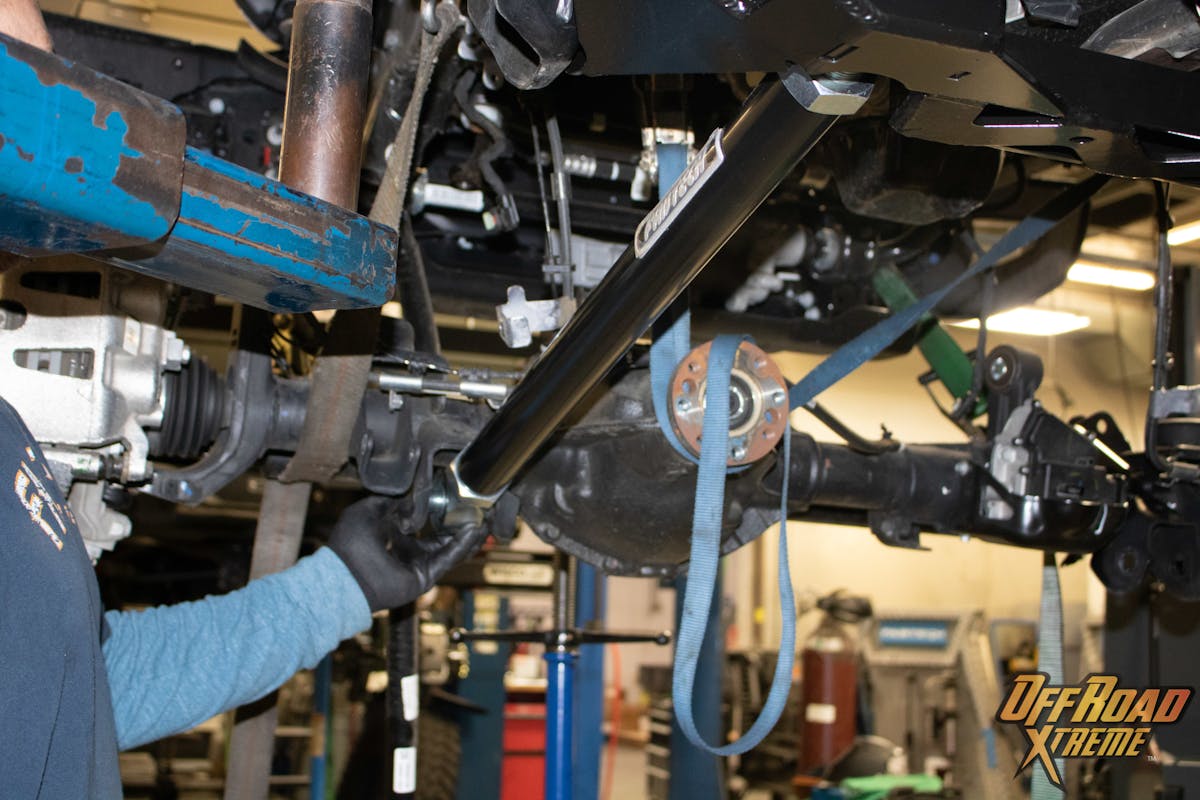 In standard fashion, the negative battery terminal was disconnected before we began. The vehicle was lifted up in the air and then the front and rear were supported by jackstands. The tires were removed and then we secured the housing before starting the disassembly. The axle housing was strapped up and supported from either side of the vehicle with heavy-duty ratchet tie-downs as well as another jackstand underneath. This gave us full control to free up whatever side we were currently working on.