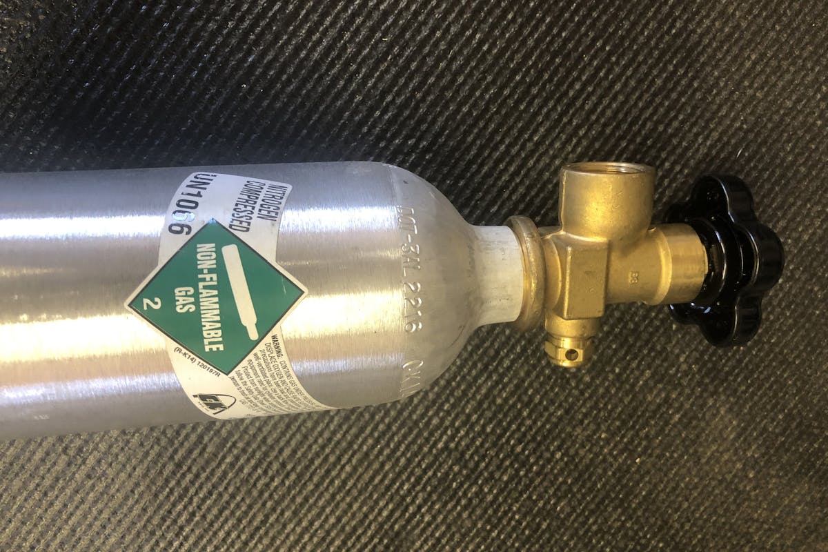 To begin, ORI’s Mark Jensen suggested we start with 100 psi of nitrogen. “The struts come with the right amount of oil in the chambers,” he said. “We charge the lower chamber first, the one down by the piston shaft. We have the struts completely collapsed. I would put 100 psi in each bottom chamber at this point. That would be a starting point for tuning.”