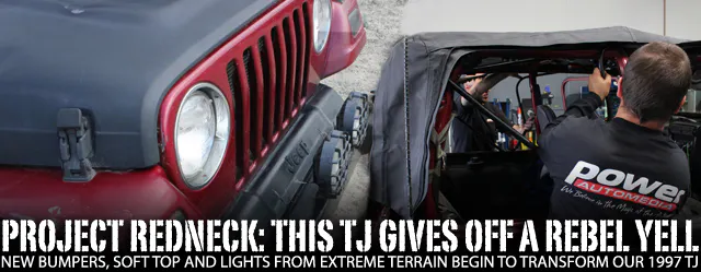 To get there, one of the first things we did was get some rock-ready supplies in order. We talked to Ryan Huck from Extreme Terrain to figure out what parts to start with in order to get Project Redneck looking fresh and ready to hit the trails, and we reached the decision to slap on some new bumpers, a soft top and a pair of front lights.