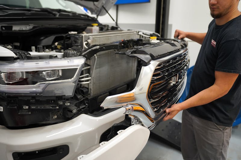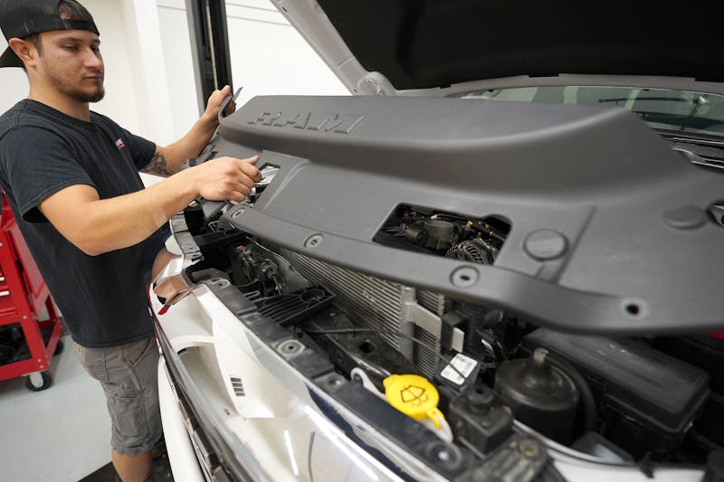 That intercooler is another key aspect of this kit. Supercharged air heats up as it’s “shoved” into the intake. The intercooler – in this kit, an air-to-air version – allows more power since the air will be denser when it’s cooler. The air-to-air option is simple and effective. The system design cools the air charge down without any complexity of water systems, pumps, wiring, or relays. Like many OEMs that use forced induction, the simple method works best for long duration use such as this Ram along with most vehicles.