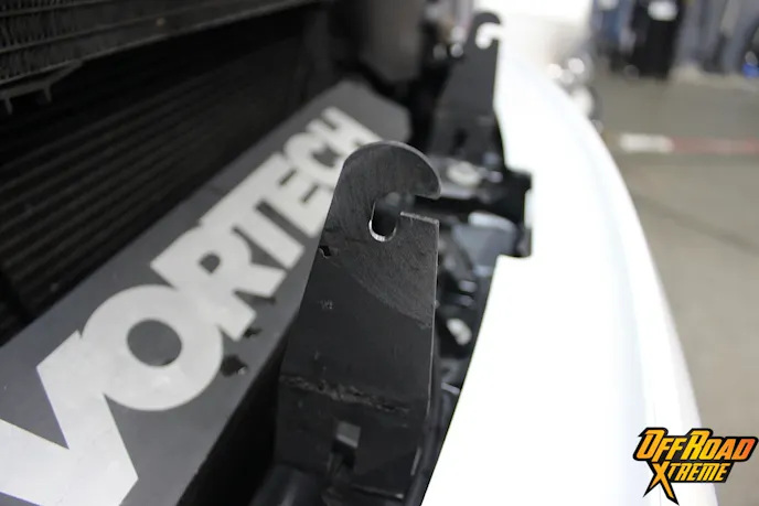 Once we had our two brackets completed, we mounted them to the existing bolts that hold the front valence and then created some spacers to appropriately position the light bar between the two brackets. The spacers were necessary now that the two brackets were farther apart than the stock width of the light bar itself. Once the brackets were attached, we bolted the light bar on (with spacers) and made sure the hoods functionality was not interfered with.